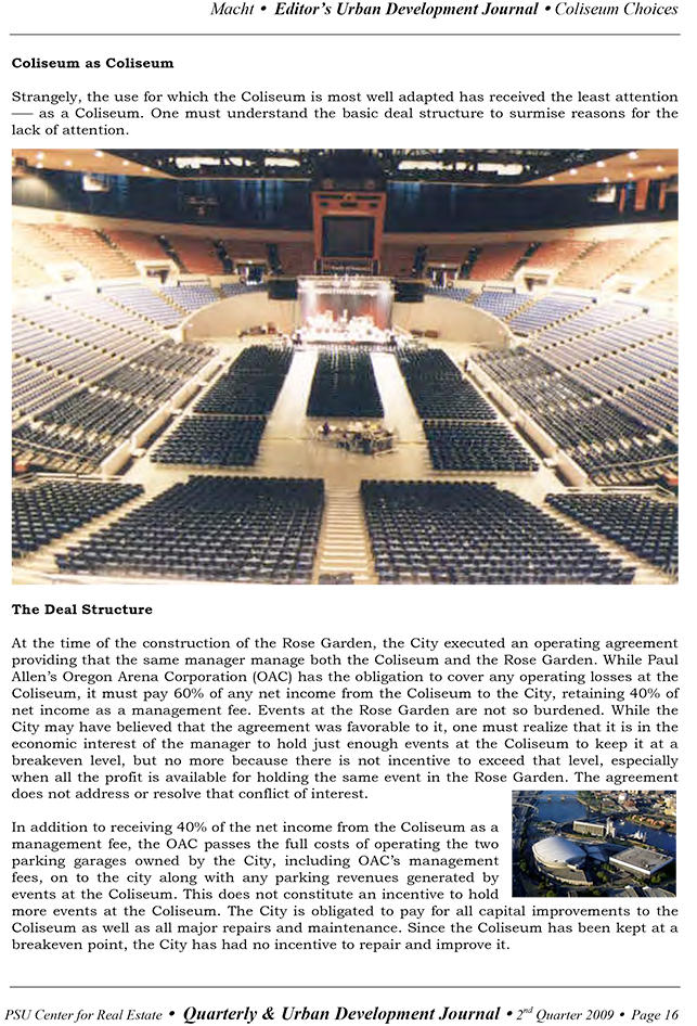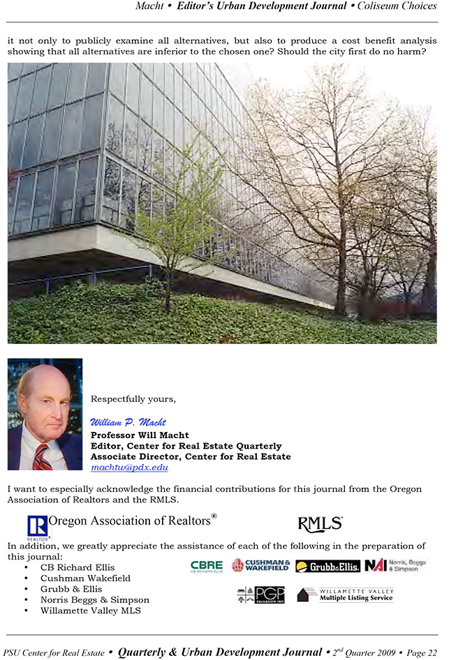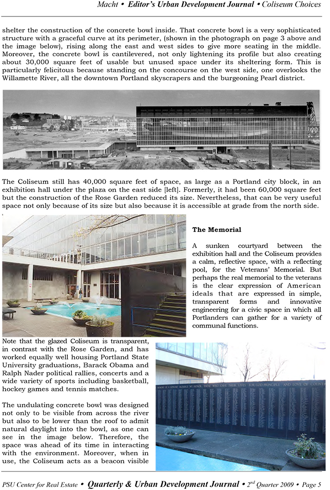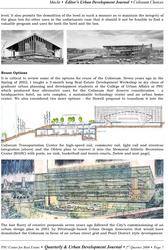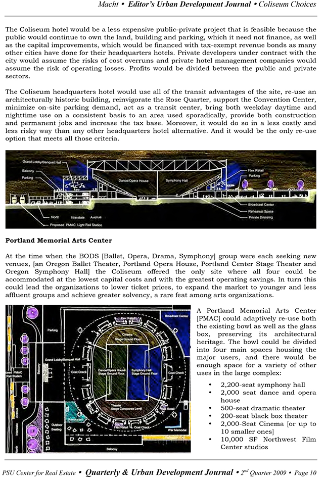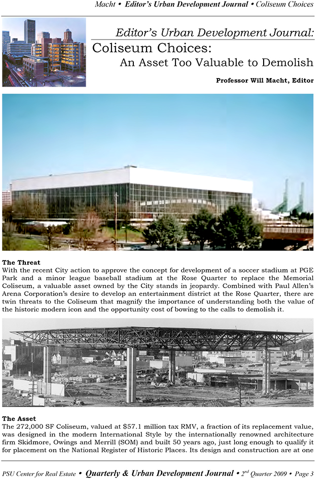 William Macht has taught real estate development and planning at Portland State University for over 28 years as well as a development consultant for the past 30 years. This report, which Macht wrote, looks at the variety of uses that have been proposed for Veterans Memorial Coliseum, as well as its underlying development agreement (in which the Portland Trail Blazers, through Portland Arena Management, are allowed to manage and operate the city-owned Coliseum in tandem with the team-owned Moda Center arena next door. Macht has long argued that the management agreement creates a financial incentive for the Coliseum’s managers to take the arena to just short of the break-even point that would trigger routine maintenance.
