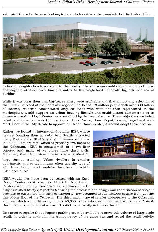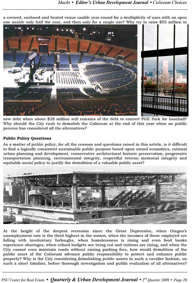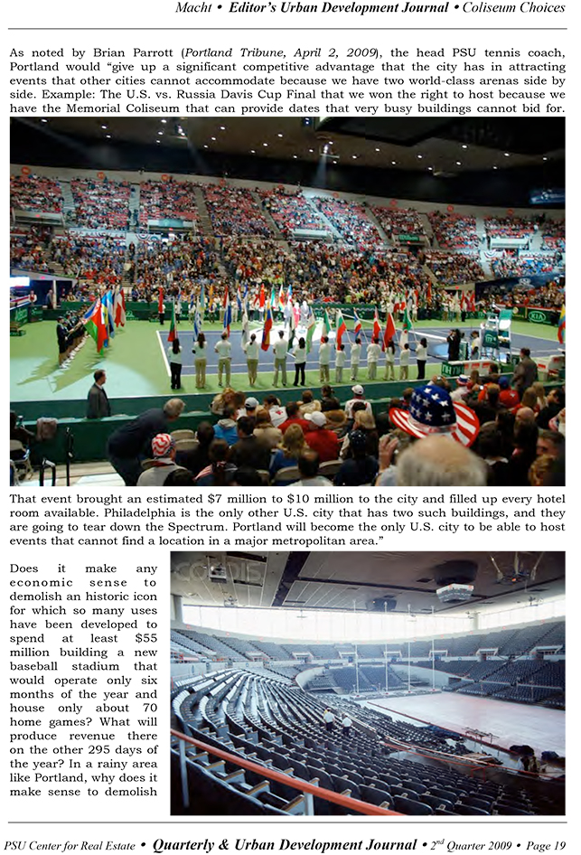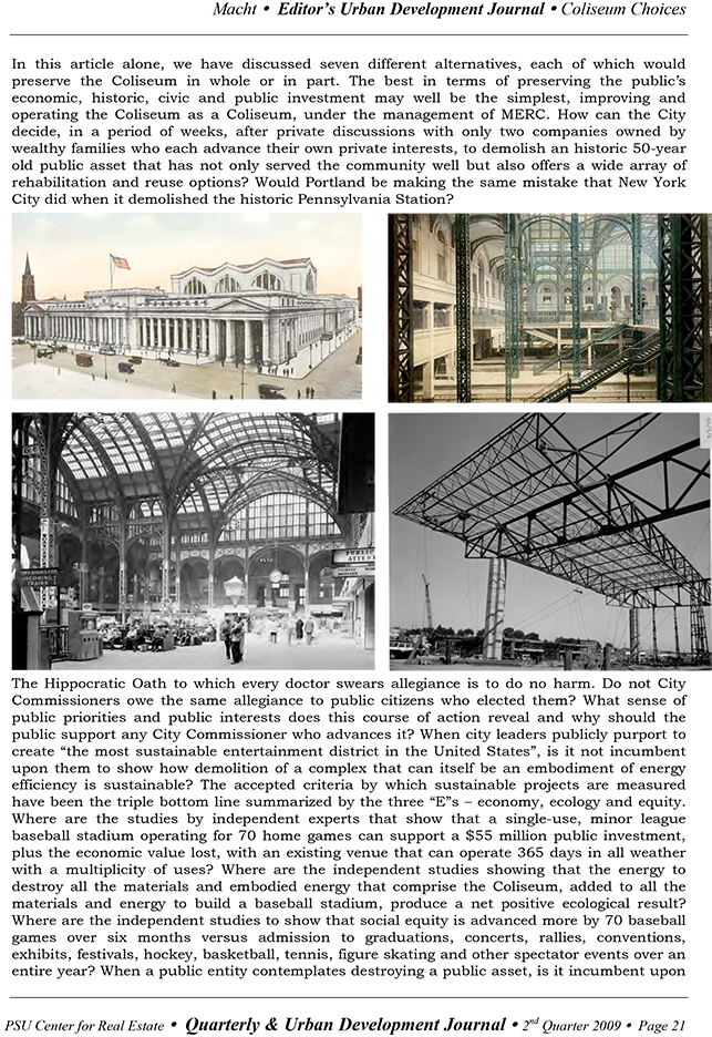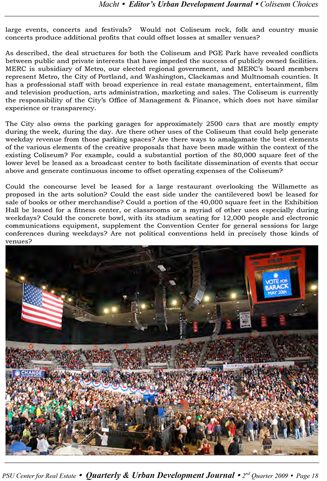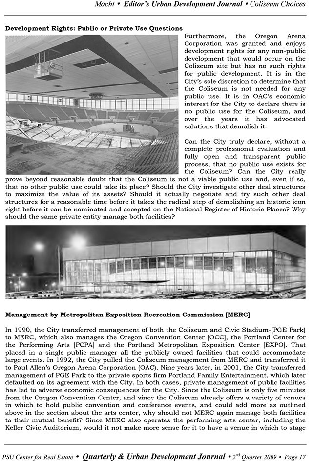 William Macht has taught real estate development and planning at Portland State University for over 28 years as well as a development consultant for the past 30 years. This report, which Macht wrote, looks at the variety of uses that have been proposed for Veterans Memorial Coliseum, as well as its underlying development agreement (in which the Portland Trail Blazers, through Portland Arena Management, are allowed to manage and operate the city-owned Coliseum in tandem with the team-owned Moda Center arena next door. Macht has long argued that the management agreement creates a financial incentive for the Coliseum’s managers to take the arena to just short of the break-even point that would trigger routine maintenance.
