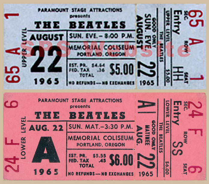 The Beatles performed two shows at Portland's Memorial Coliseum, before a total of 20,000 people. Tickets for each of the shows were priced at $4, $5 and $6. There were also a number of pink tickets for the Coliseum's upper level which were free.